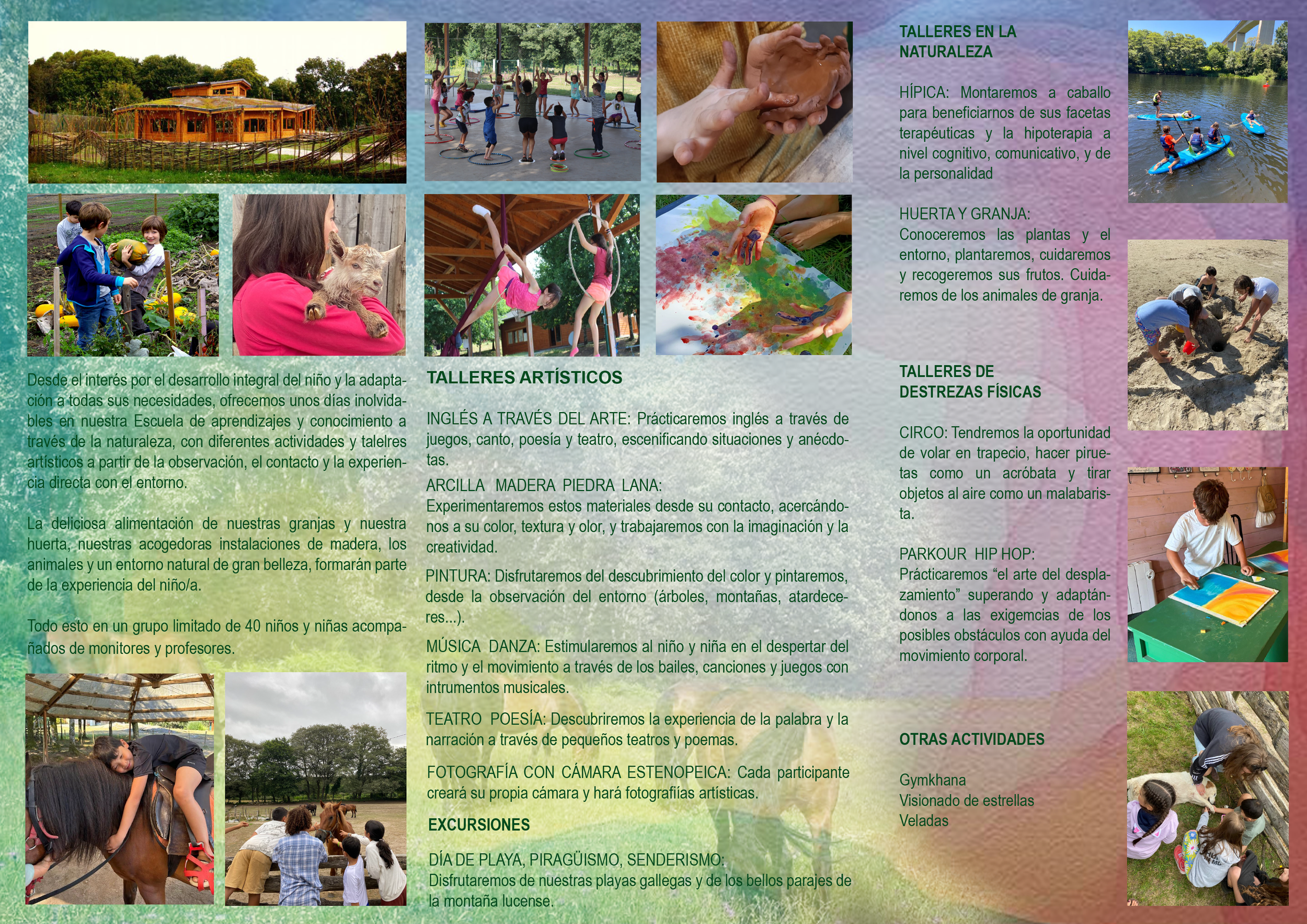 Desde el interés por el desarrollo integral del niño y la atención a todas sus necesidades, ofrecemos unos días inolvidables en nuestra Escuela de aprendizaje y conocimiento a través de la naturaleza, con diferentes actividades y talleres artísticos a partir de la observación, el contacto y la experiencia directa con el entorno.